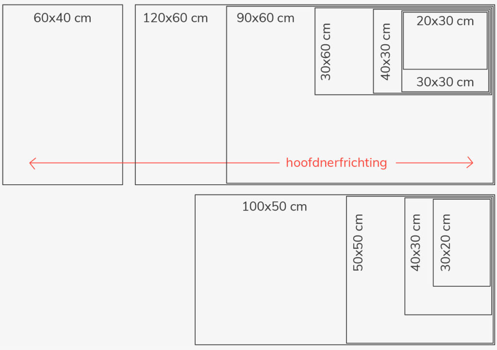 Bei Holzarten mit einer Faserrichtung (bei Wellpappe in Richtung der Rillen) verläuft diese immer parallel zur längsten Seite des Brettes. Das gilt für alle Maße außer 60 x 40 cm, wo die Faserrichtung parallel zur kurzen Seite verläuft.